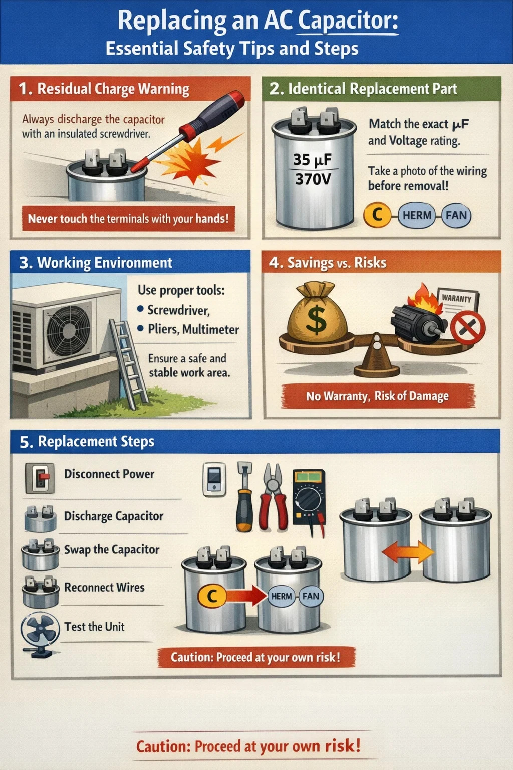 Garantin ogiltig: Om din luftkonditioneringsapparat fortfarande omfattas av garantin kan tillverkarens garanti ogiltigförklaras om du själv byter AC-kondensatorn.