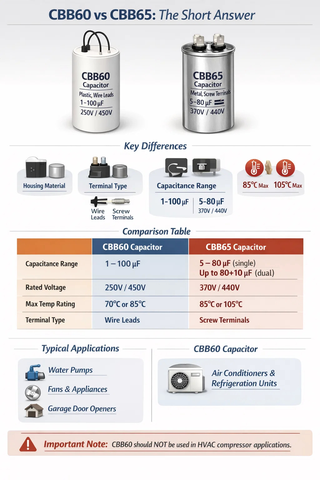 Den grundläggande skillnaden mellan en CBB60 kondensator och en CBB65-kondensator beror på fysisk konstruktion och avsedd applikationsmiljö. CBB60 är en cylindrisk, trådförsedd kondensator främst designad för enfas AC-motorstart och driftkretsar , medan CBB65 är en metallburk, skruvterminal kondensator konstruerad för tyngre applikationer som luftkonditioneringskompressorer och kylenheter. Båda är polypropenfilmkondensatorer som fungerar på växelströmskretsar, men de skiljer sig avsevärt i formfaktor, terminaltyp, kapacitansintervall och termisk motståndskraft.