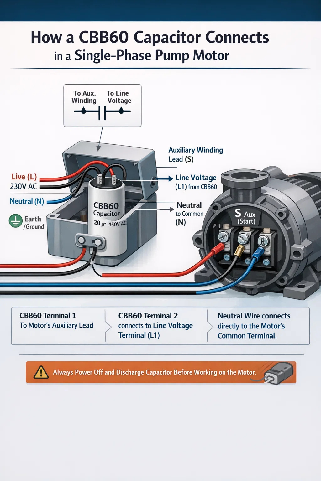 Denna procedur täcker den vanligaste installationen av CBB60: en enfas vattenpump eller poolpumpmotor, antingen med en extern kondensatorkapsling eller med kondensatorn direkt inuti motorns kopplingslåda. Samma logik gäller för luftkompressorer, tvättmaskiner och HVAC-fläktmotorer.