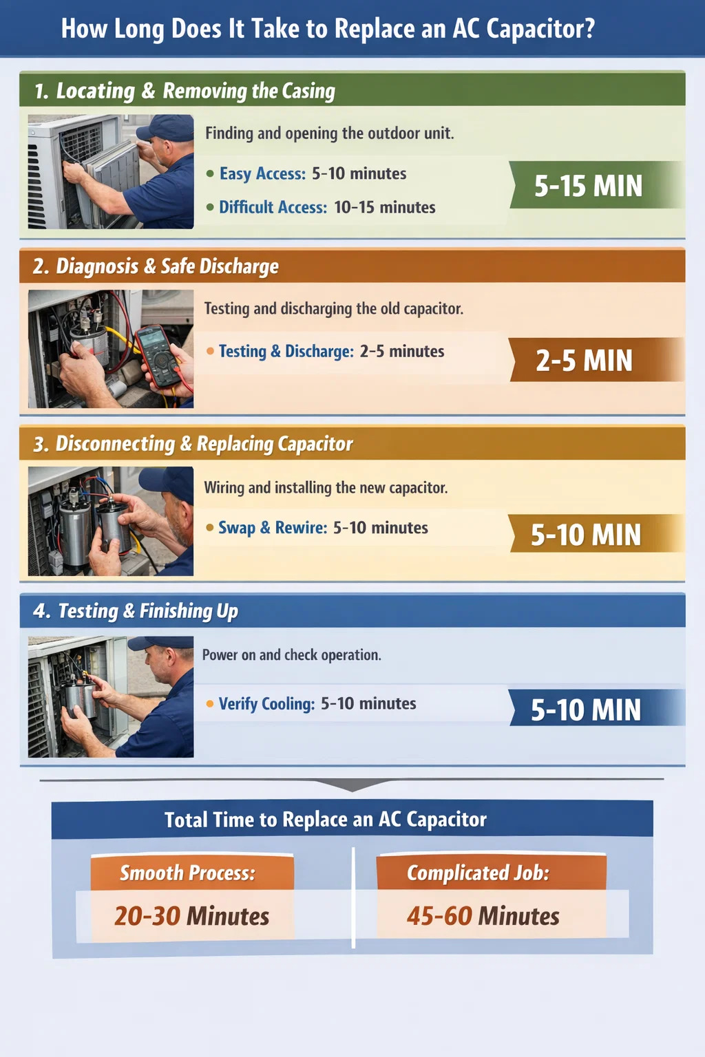 Hur lång tid tar det egentligen att byta ut en AC kondensator ? Om du bara tittar på de få minuter som teknikern arbetar, kanske du tycker att jobbet går förvånansvärt snabbt. Men från det ögonblick som teknikern kommer tills luftkonditioneringen blåser kall luft igen, är det en komplett process inblandad.
