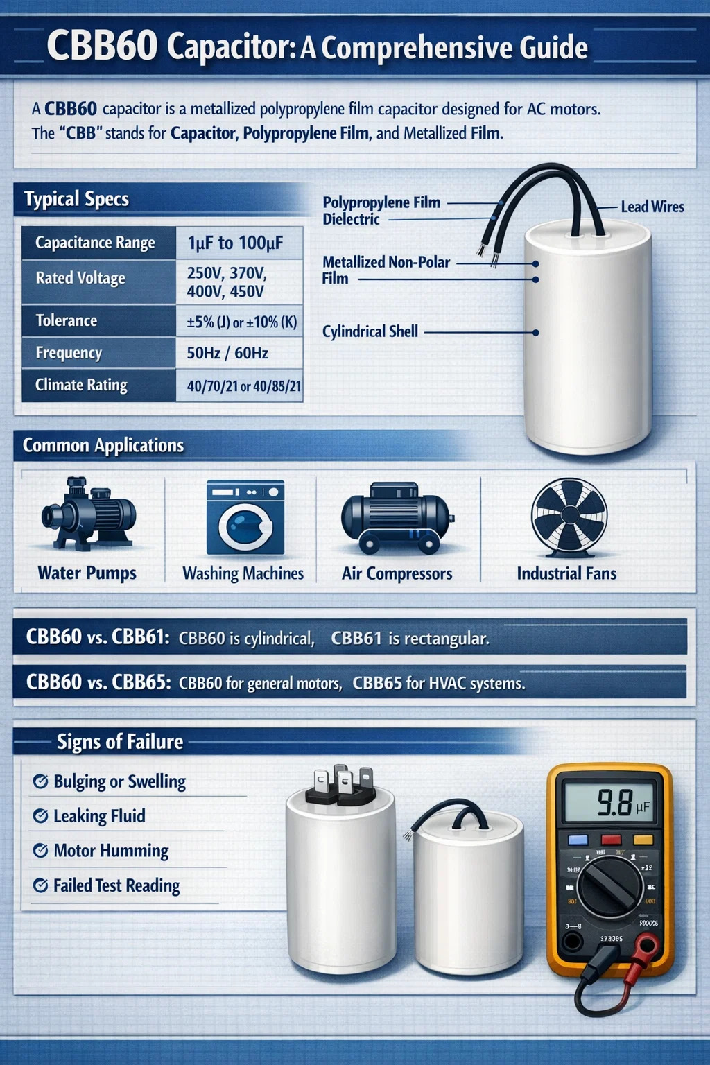 A CBB60 kondensator är en specialiserad typ av kondensator av metalliserad polypropenfilm som främst är designad för växelströmsmotortillämpningar. Beteckningen "CBB" står för dess materialsammansättning: "C" för kondensator, "B" för dielektrisk polypropenfilm och den andra "B" för opolär metalliserad film. Dessa kondensatorer är officiellt klassificerade som driftskondensatorer, vilket innebär att de stannar i kretsen medan motorn arbetar för att bibehålla vridmoment och förbättra effektiviteten.