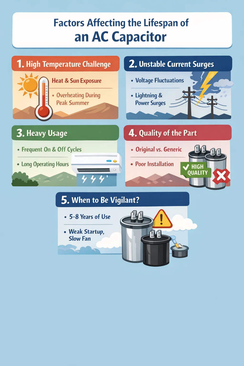 Spänningsfluktuationer: Om spänningen runt ditt hem är instabil, ofta fluktuerande, måste AC-kondensatorn laddas och laddas ur upprepade gånger för att balansera strömmen. Detta frekventa "stressande arbete" påskyndar åldrandet av dess inre material.