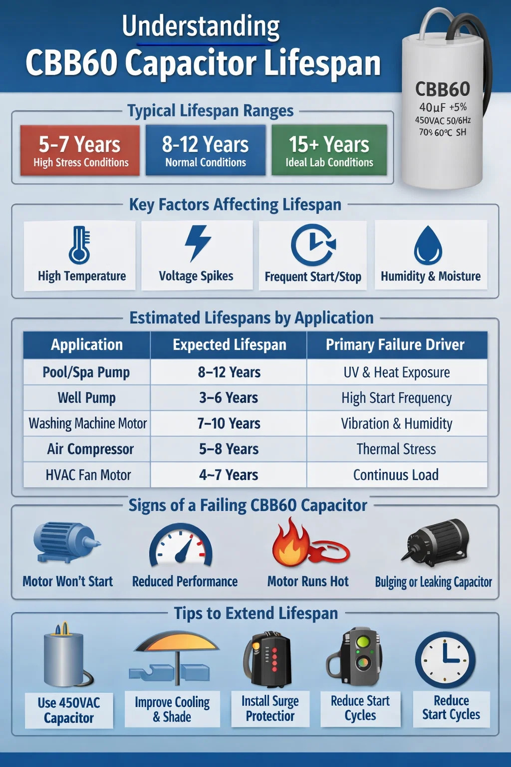 Ingen enskild faktor styr hur länge en CBB60-driftkondensator varar. Livslängd är det kumulativa resultatet av termisk stress, spänningsexponering, fuktighet och användningsmönster. Nedan är de mest kritiska variablerna: