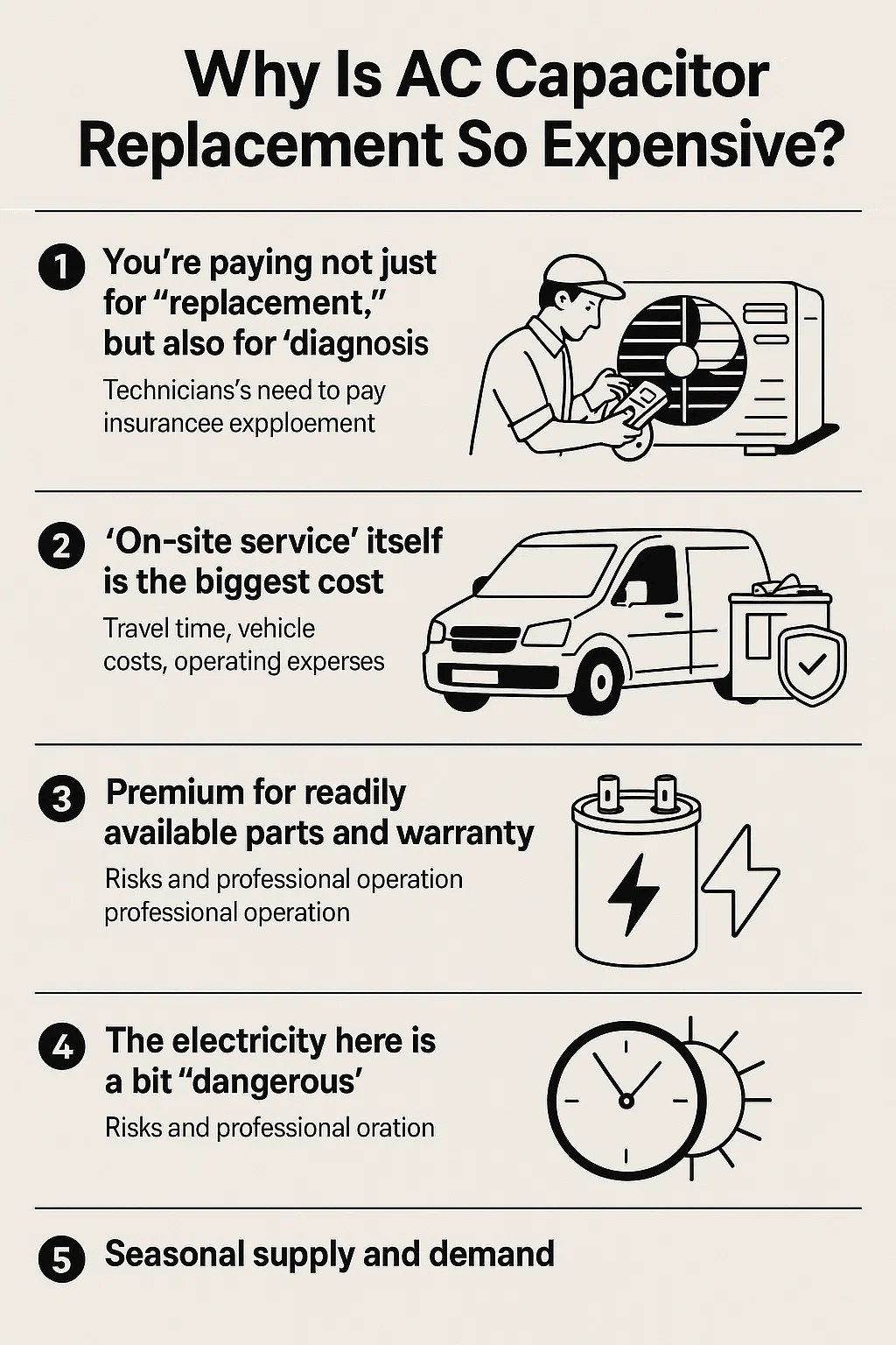 Många människor som har fått sina luftkonditioneringskondensatorer utbytta har förmodligen undrat: Varför kommer det sig att denna lilla cylindriska del – AC kondensator – är det så billigt när jag söker efter det på nätet, men räkningen är flera gånger högre när en tekniker kommer för att byta ut den?
